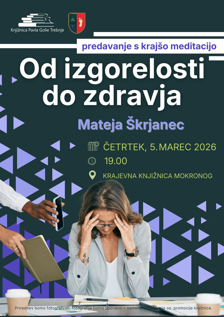 Vabljeni, v četrtek, 5. 3. 2026 ob 19:00, v Krajevno knjižnico Mokronog na predavanje z meditacijo Od izgorelosti do zdravja.