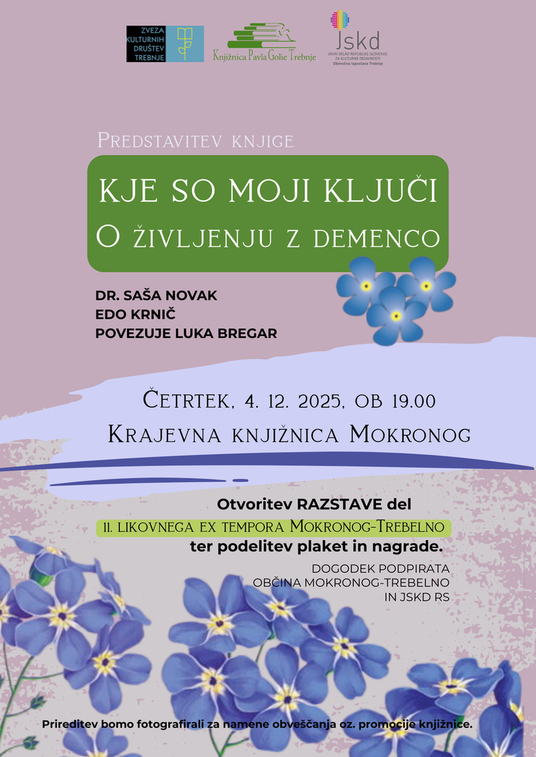 Demenca je bolezen, ki ne prizadene le obolelega, temveč vso družino. Je tiha vsiljivka. Pride počasi, ne da bi se najprej najavila, in se najprej naseli v drobnih trenutkih – pozabljen ključ, napačen hodnik, zmeden pogled ob znanem obrazu. V knjižnici Mokronog bomo o zgodbah iz knjige govorili z urednikoma, dr. Sašo Novak in Edom Krničem. Pogovor bo vodil Luka Bregar, ki je tudi avtor ene izmed zgodb v knjigi.