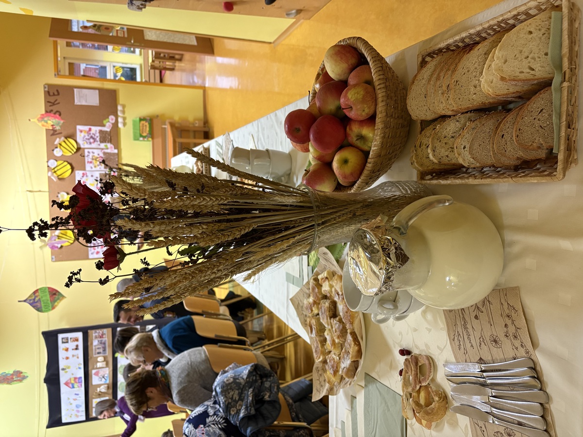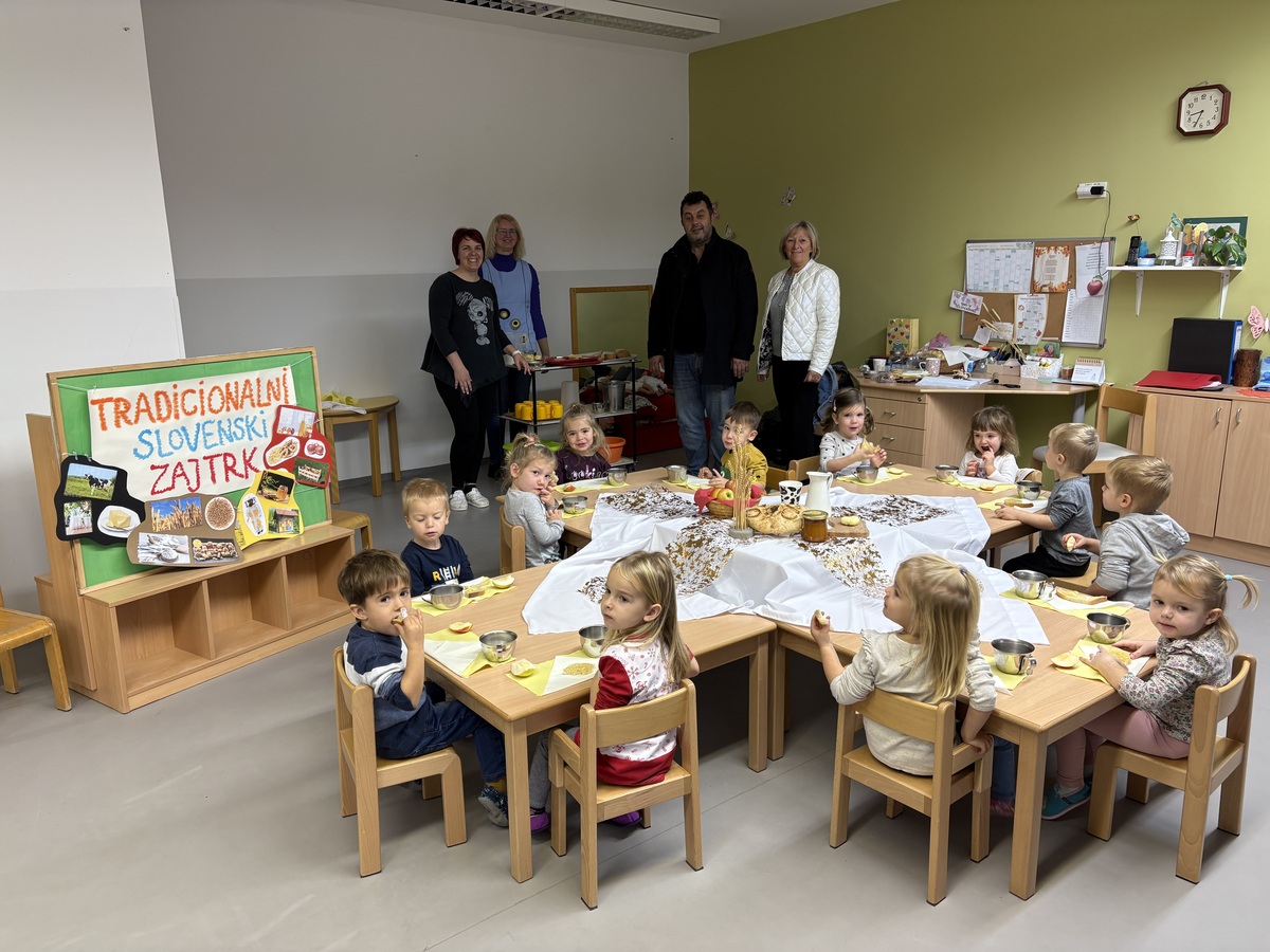 »S travnikov zelenih, drevesnih krošenj obteženih, polja žitnega in čebelnjaka, na mizi že vas zajtrk čaka.«(Miha Hančič, ilustrator letošnjega plakata za Tradicionalni slovenski zajtrk). S temi besedami je program zaključila vodja vrtca, ga. Suzana Ručman, ter vse prisotne povabila k bogato obloženi mizi domačih dobrot, pripravljenih z ljubeznijo in spretnostjo vzgojiteljice ga. Bojane Gregorčič.
