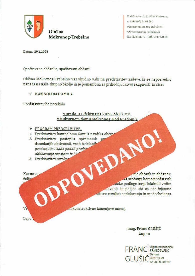 Glede na javno mnenje, civilno iniciativo proti vzpostavitvi kamnoloma Gomila in glede na okoliščine predpogodbe, preklicujemo napovedano vabilo za predstavitev aktivnosti za vzpostavitev kamnoloma Gomila, ki je bila predvidena dne 11.2.2026, v prostorih Občine Mokronog-Trebelno. Po posvetu s svetniki, ki sem jim to predlagal, se svetniki s tako točko dnevnega reda strinjajo.