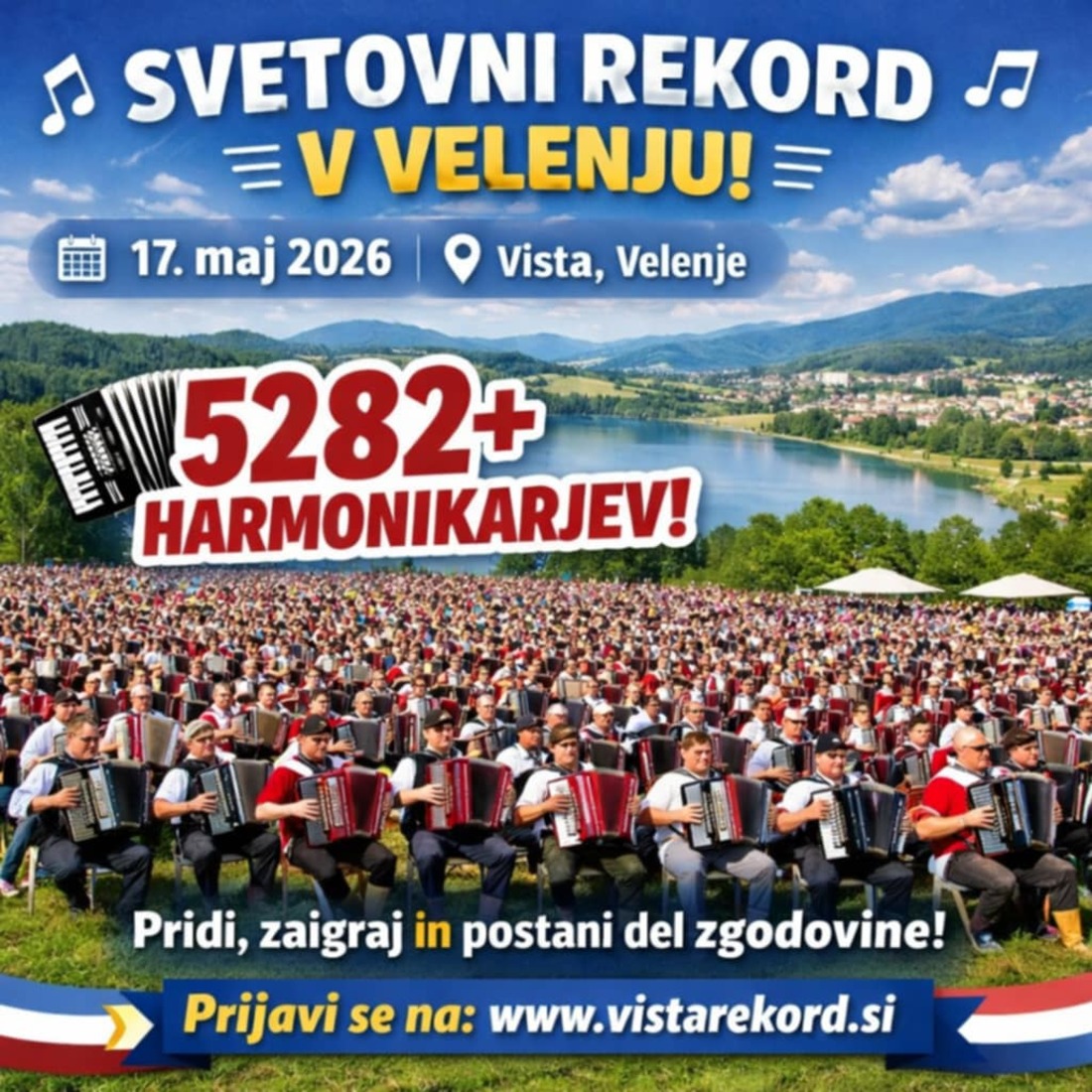Slovenija se pripravlja na izjemen glasbeni mejnik! V nedeljo, 17. maja 2026, bo na Velenjski Visti potekalo podiranje Guinnessovega svetovnega rekorda v največjem številu harmonikarjev na enem mestu. Dogodek, ki ga že zdaj z nestrpnostjo pričakuje vsa država, bo postal vseslovenski harmonikarski praznik stoletja.